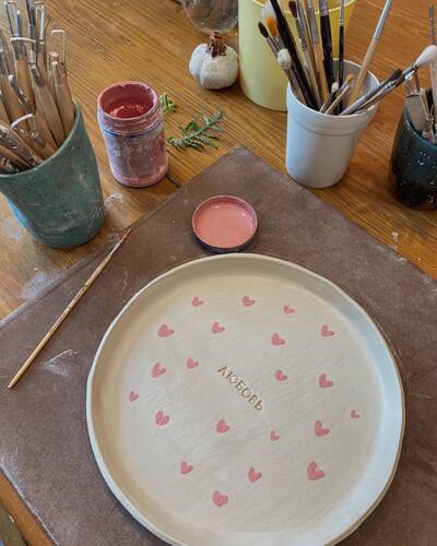Интерьер так и просится на фото и в Инстаграм, огоньки и гирлянды создают атмосферу, красиво сервированный стол, а все гости вечеринки слепят из глины что-нибудь особенное под руководством мастера✨